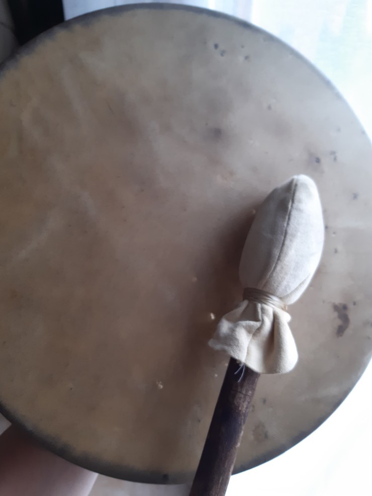 Quand j’ai reçu mon tambour de soin (healing drum), fait pour moi par une personne merveilleuse et connectée, qui a sélectionné une peau de cerf (deer) et qui a choisi le bois de chêne (oak) pour ma connexion au druidisme, je l’ai tout de suite adopté et lui aussi, m’a adopté.