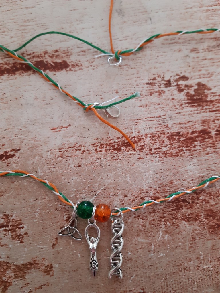 Dans le cas de la déesse celte, elle me demandait de rajouter des perles verte et orange (le blanc étant représenté par la déesse elle-même), d’un fil vert, j’ai rajouté un fil orange et un fil blanc, les 3 fils ont souhaité une tresse. La tresse des déesses ! Et ce talisman a finit par devenir la déesse irlandaise. Ce talisman m’a donné beaucoup de fil à retordre à tresser.