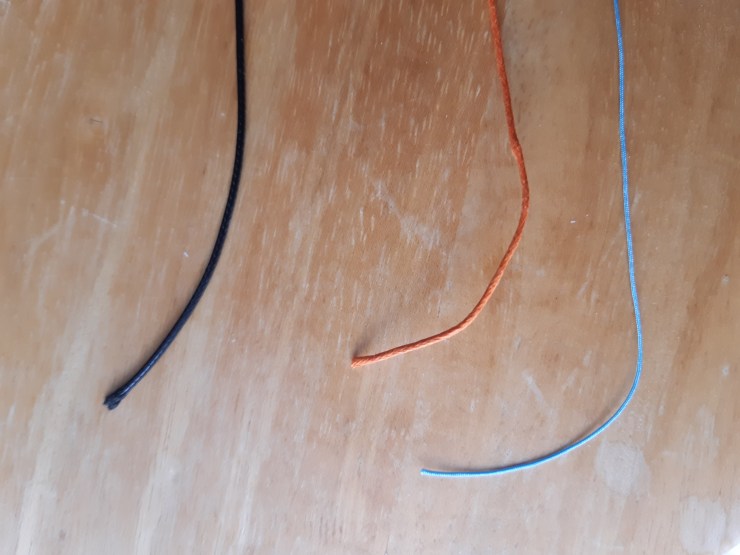 Pour la fermeture, j’ai testé et ça n’a pas été concluant, j’ai donc changé de technique, en liant le nœud vert et l’orange, le blanc étant trop court. Le collier n’est donc pas réglable.