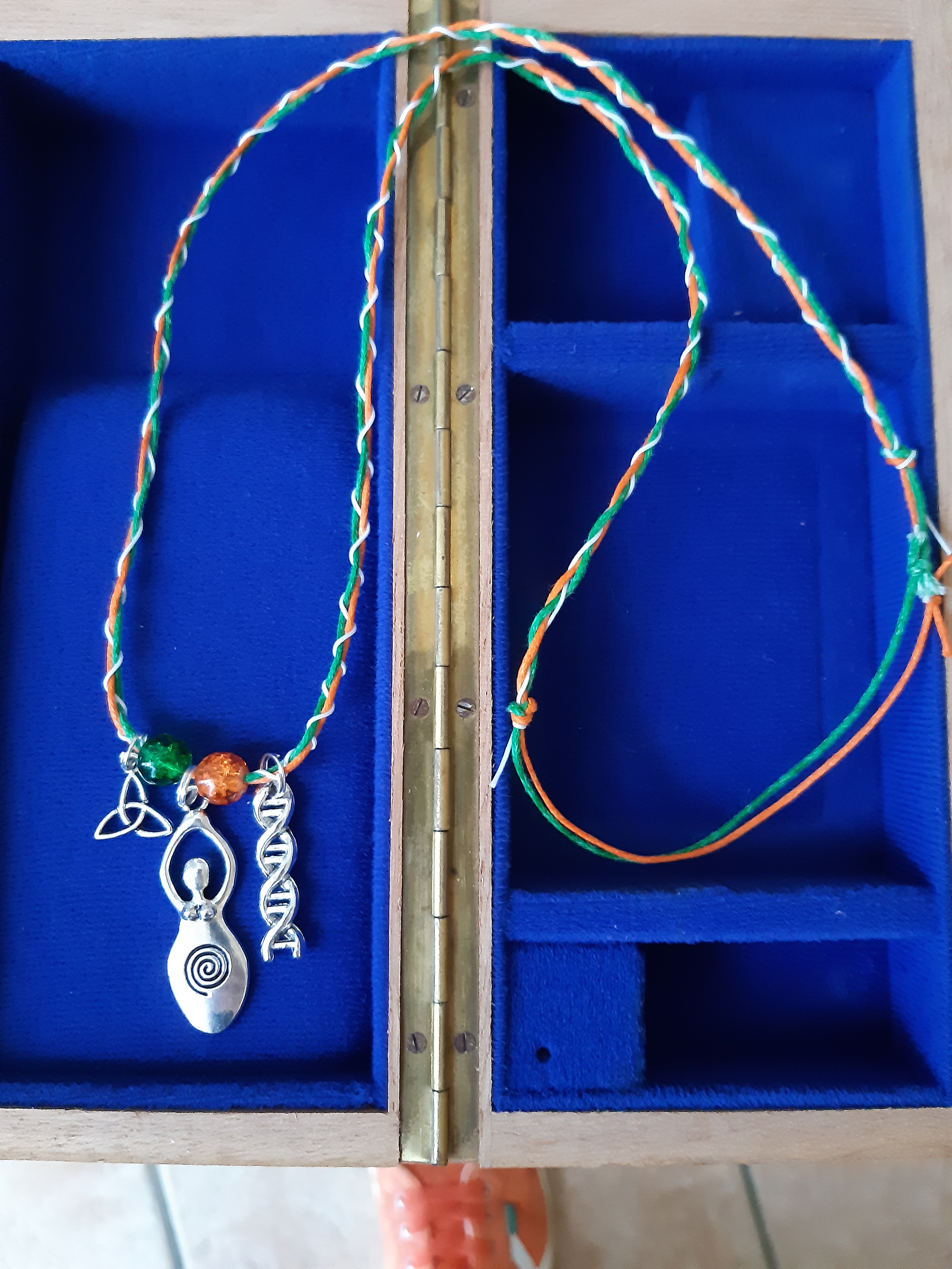 Dans le cas de la déesse celte, elle me demandait de rajouter des perles verte et orange (le blanc étant représenté par la déesse elle-même), d’un fil vert, j’ai rajouté un fil orange et un fil blanc, les 3 fils ont souhaité une tresse. La tresse des déesses ! Et ce talisman a finit par devenir la déesse irlandaise. Ce talisman m’a donné beaucoup de fil à retordre à tresser.