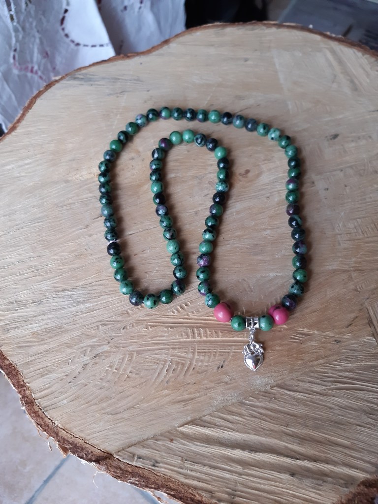 Perles 8mm de Jaspe vert, Kambaba, Rouge et Breschia. Grande breloque arbre.
