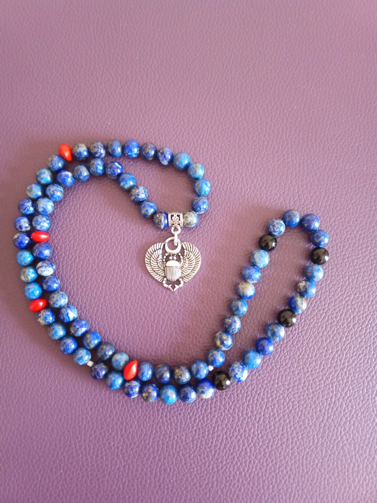 Perles 8mm de Lapis Lazuli, 4 Obsidienne noire 4 graines rouge Huayruro femelle, scarabée Kheper.