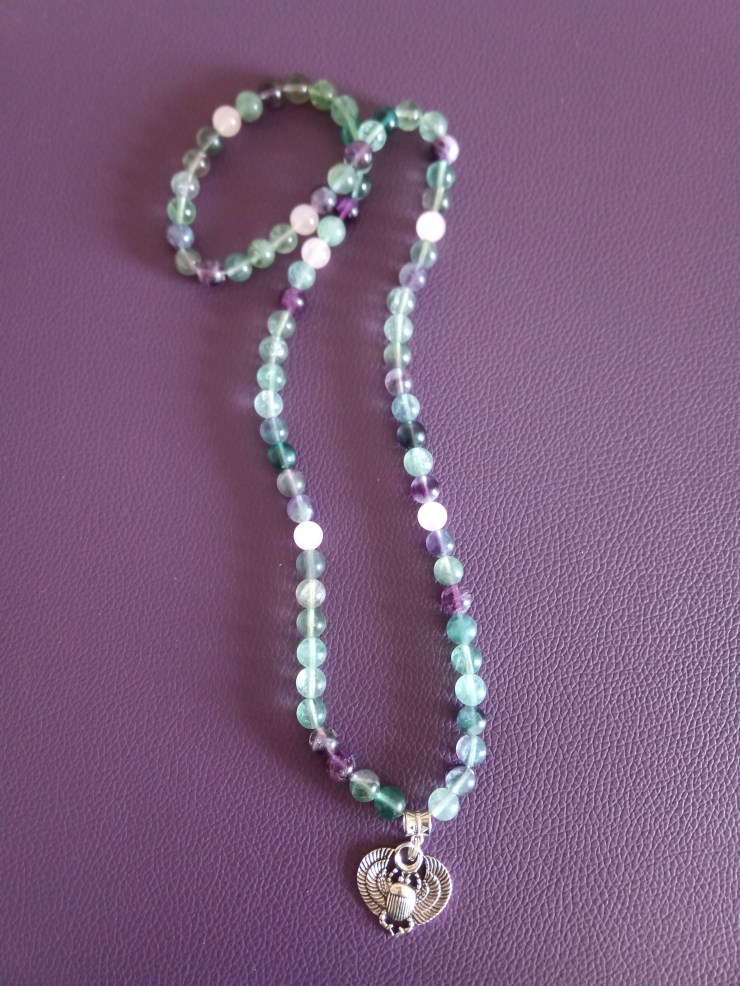 Perles 8mm de Fluorite (ou fluorine) et quelques quartz Rose. Breloque Scarabée Kheper égyptien.