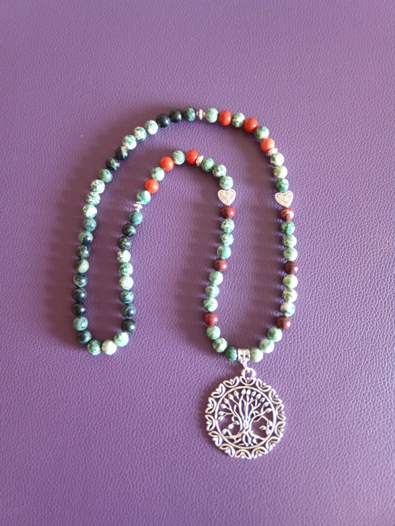Perles 8mm de Jaspe vert, Kambaba, Rouge et Breschia. Grande breloque arbre.