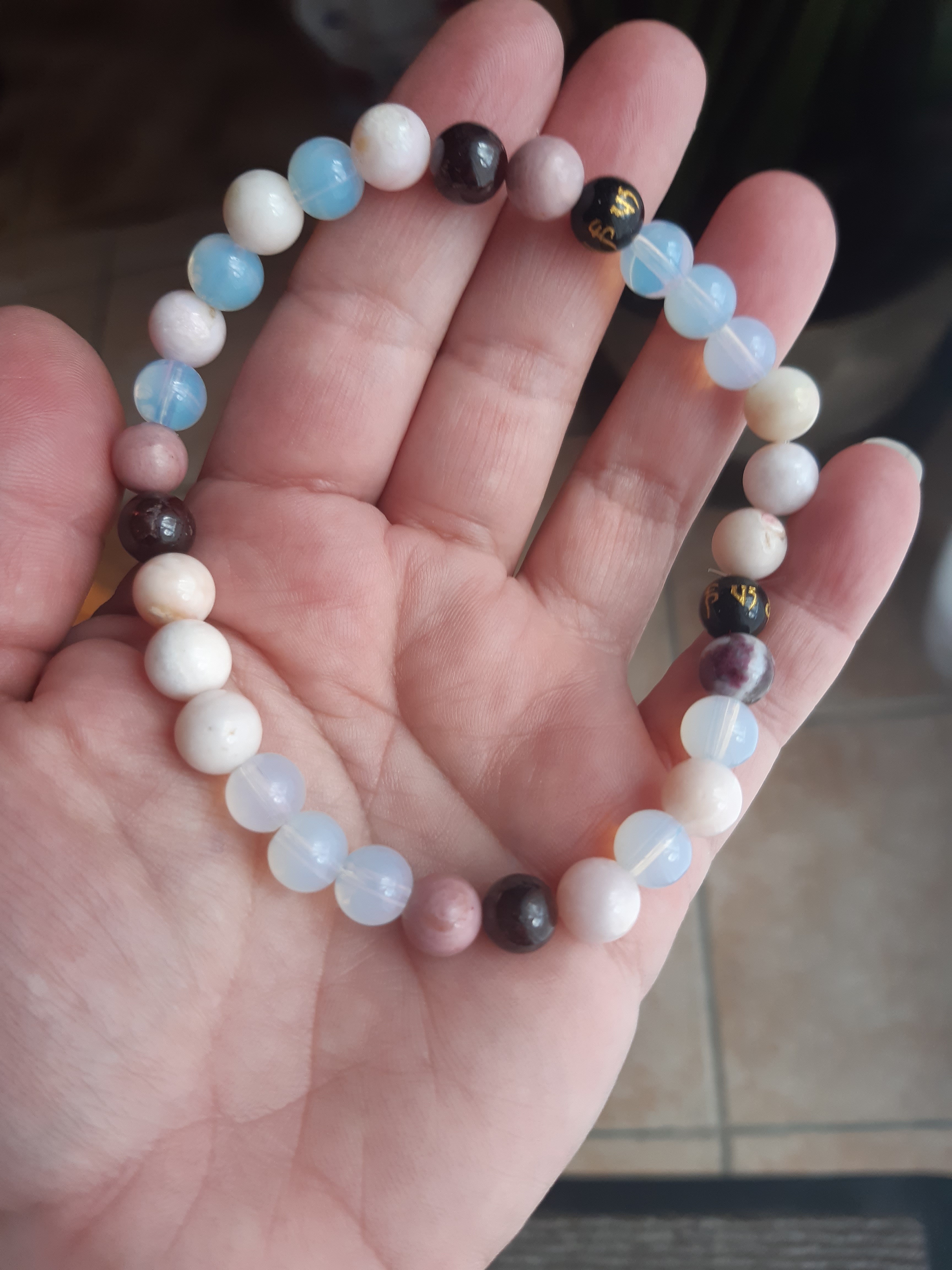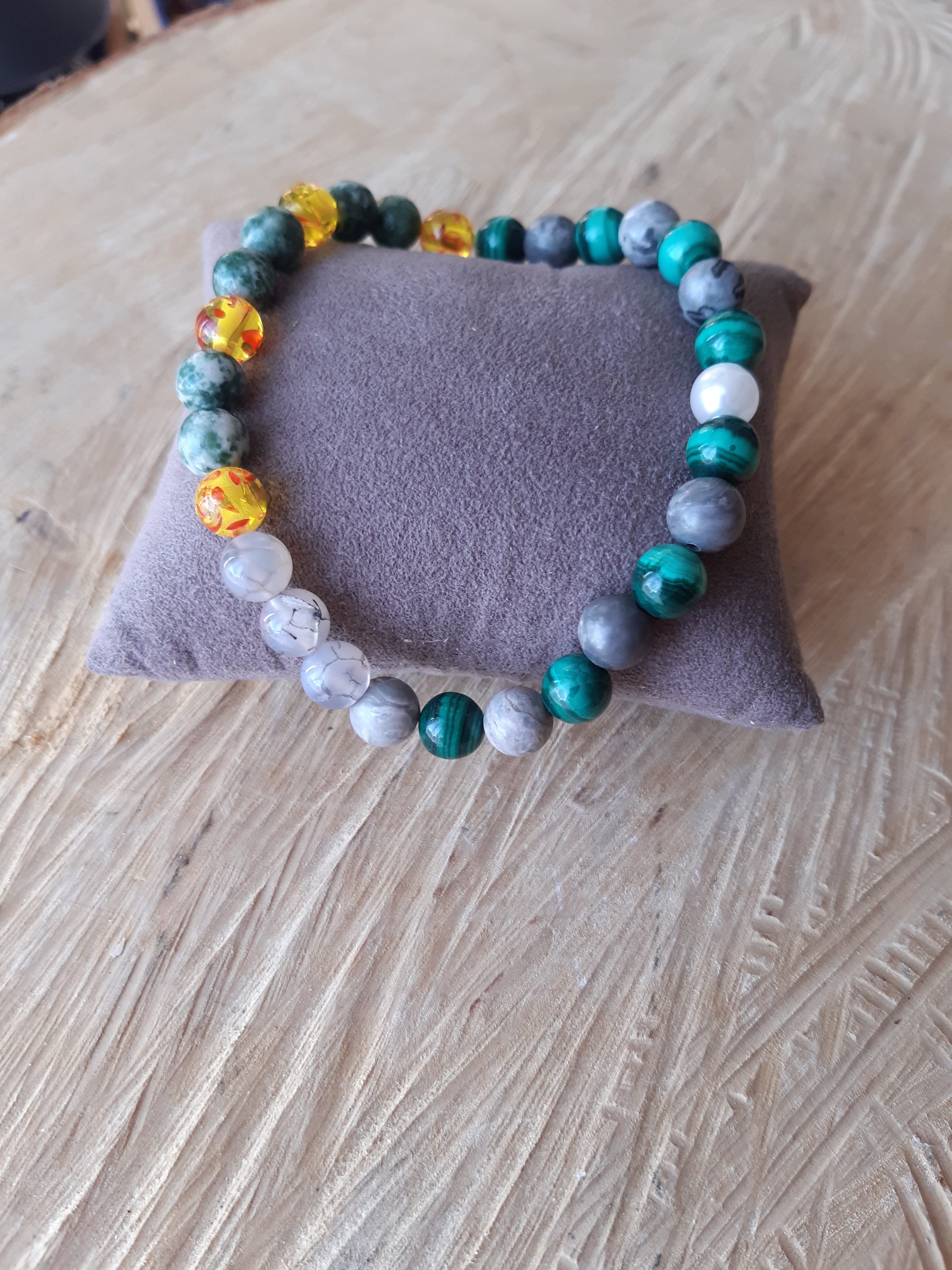 Création à la demande exclusivement, elles sont fabriquées avec des perles de 8mm et un ou deux fils élastiques.