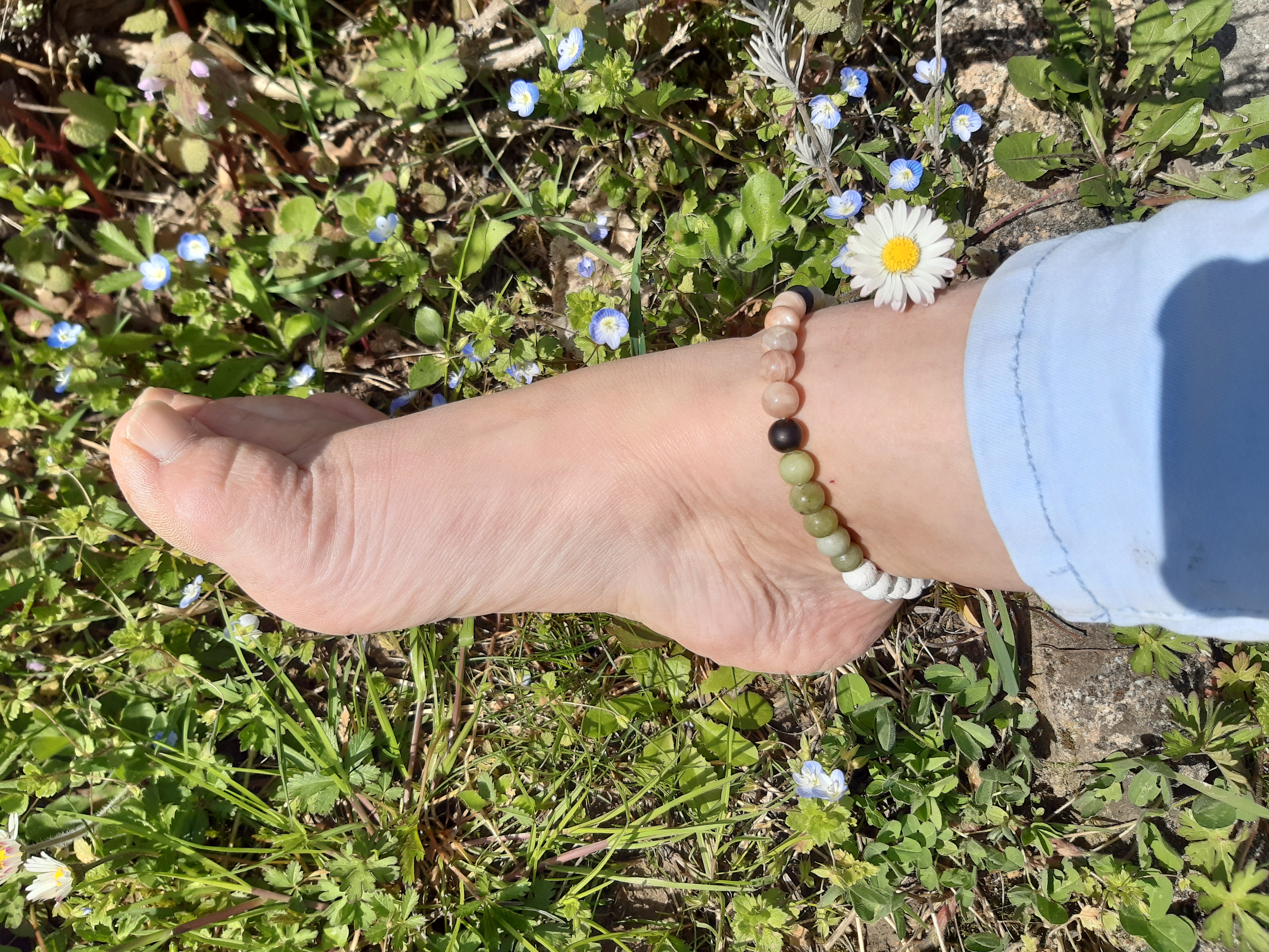 Si la chevillère est mouillée, bien l’essuyer. Ne pas la laisser au soleil, à la chaleur ou au froid. Si les pierres ternissent, massez les pierres délicatement avec un chiffon doux. Vous pouvez poser la chevillère régulièrement dans une coquille St Jacques, sur une fleur de vie ou tout autre symbole sacré.