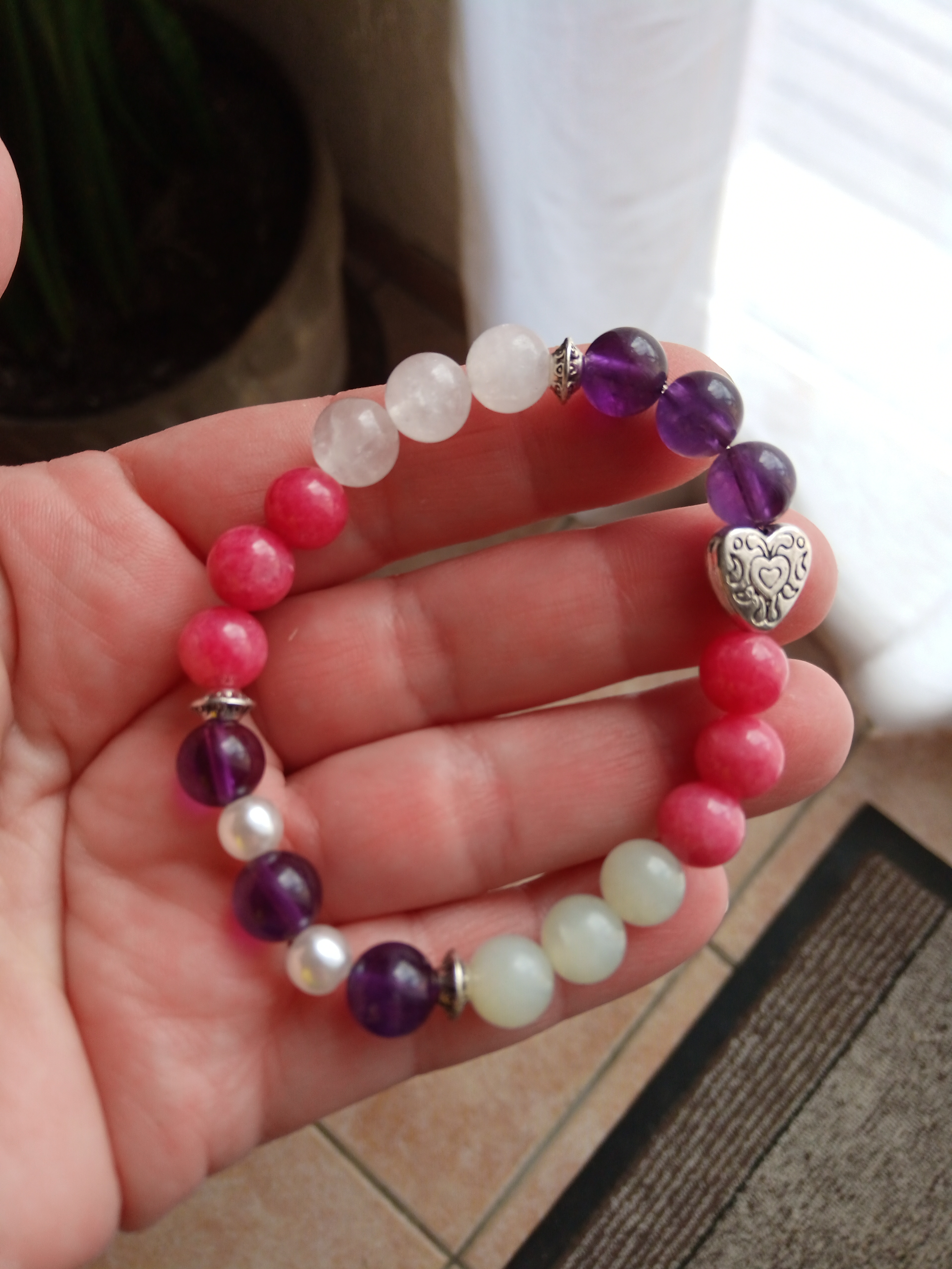 Si le bracelet est mouillé, bien l’essuyer. Ne pas le laisser au soleil, à la chaleur ou au froid. Si les pierres ternissent, massez les pierres délicatement avec un chiffon doux. Vous pouvez poser le bracelet régulièrement dans une coquille St Jacques, sur une fleur de vie ou tout autre symbole sacré.