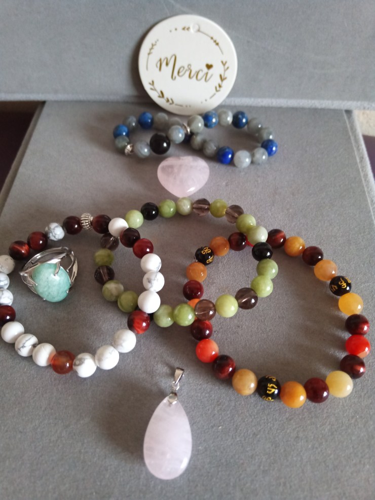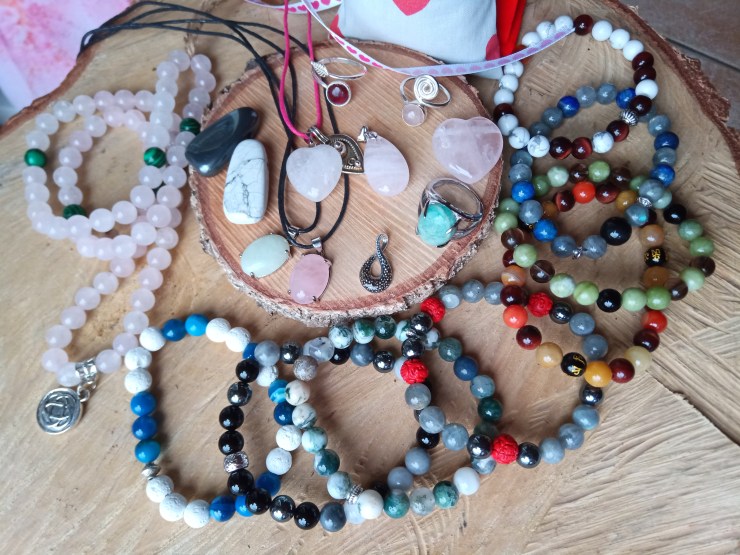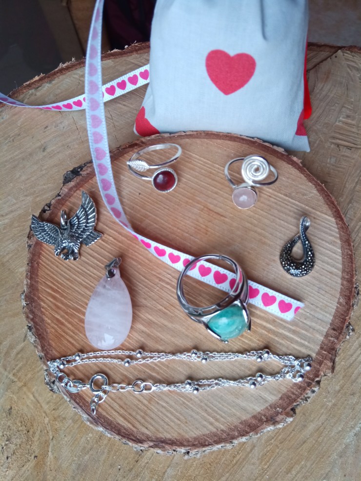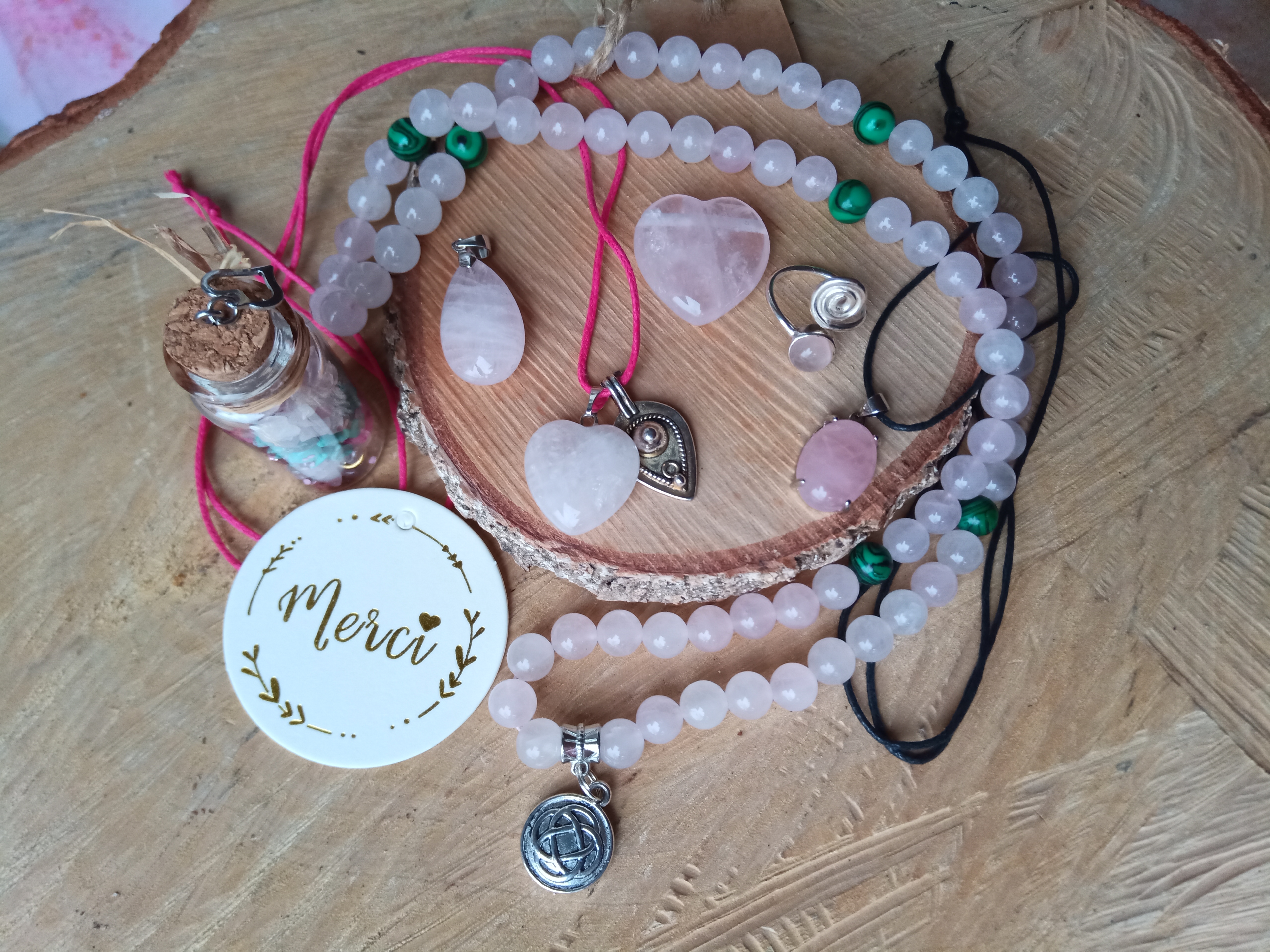 A l’honneur le Quartz rose : sur pendentifs en argent ou non, bague et collier en perles 8mm, Fiole de Vie S’aimer